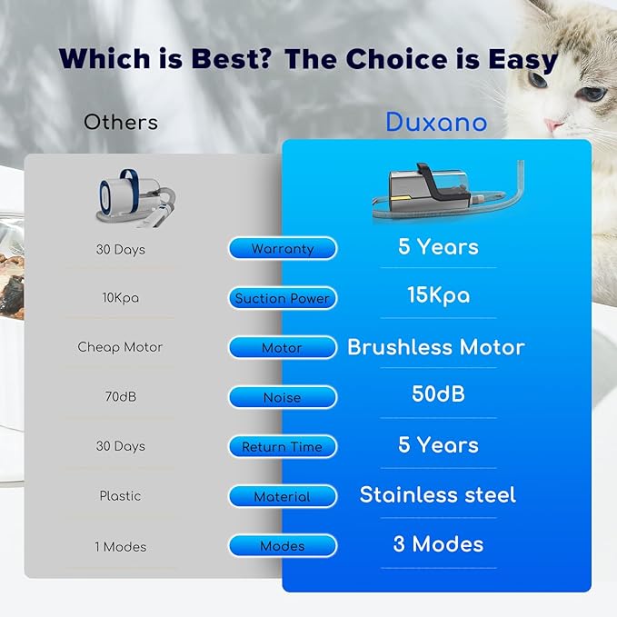 - 【Strong Suction】 With a brushless motor, DUXANO Pet Grooming Kit provides 15,000Pa of suction power in MAX mode, making it easy to capture 99% of pet hair, debris, dust, and more.