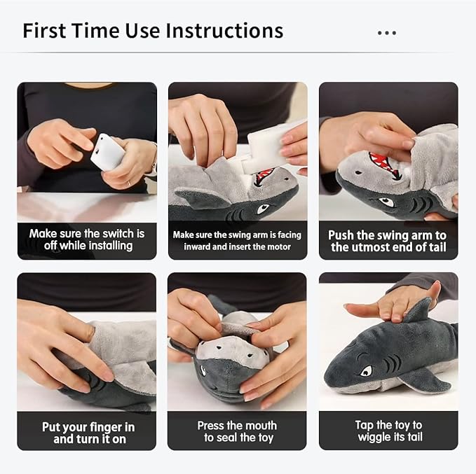 - 【Easy to Use】To ensure ease of use, ensure the switch is off and facing the shark's belly during installation. Push the electric motor to the far end of the tail and press the mouth to seal the toy. Finally, turn on the switch and tap the toy to make its tail wiggle