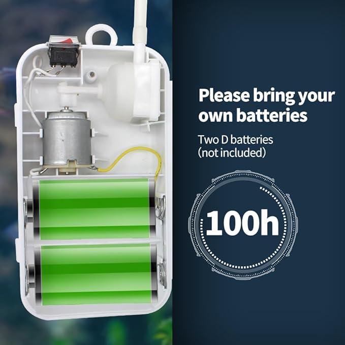 - [Battery]: This air pump does not require a large 12 volt old battery, only 2 D-sized batteries can power for over 100 hours, greatly reducing weight.