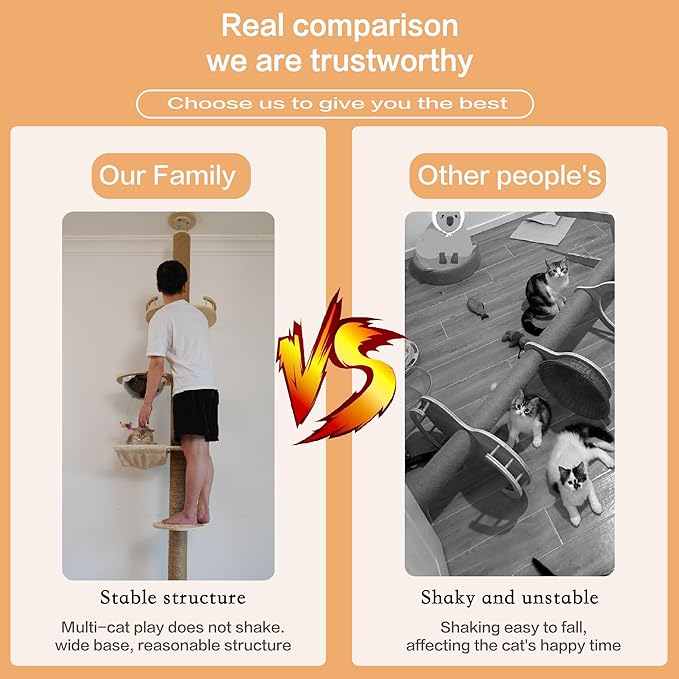 - Sturdy Floor-to-Ceiling Cat Tree with Stable Structure The top structure of this heavy-duty floor-to-ceiling cat climber is reinforced with 3 heavy-duty steel screws and paired with a stable base, supporting up to 140 lbs to ensure zero wobble for multi-cat households. The innovative design requires no drillingโsimply adjust the height between 55" and 120" to fit standard to extra-tall ceilings, providing a safe climbing experience without damaging walls.