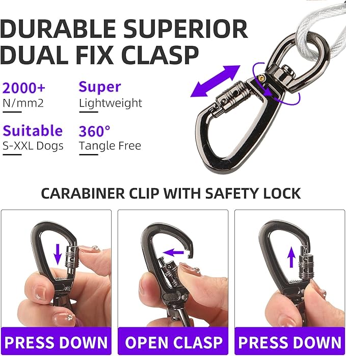 - Upgrade Heavy Duty Buckle & 360ยฐ Tangle Free-dog cable use heavy duty locking carabiner, stronger and more durable, with a 360ยฐ smooth rotation axis, your dog can run freely without getting tangled.