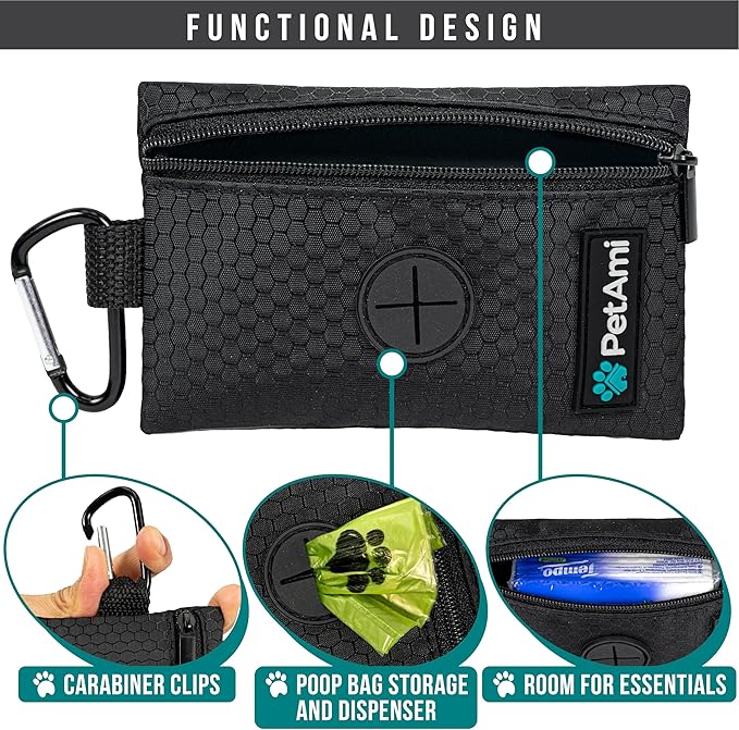 - DOG POOP BAG HOLDER: Pet dog poop bag dispenser carrier measures 5 x 0.25 x 3.25 inches and includes 1 roll of dog poop bags. Soft fabric dog bag holder dispenses waste bags and comes with a carabiner clip, zipper pocket, and velcro straps. Ideal for puppy, pet, dog walking bag for daily walks, jogging, camping, hiking, and travel.