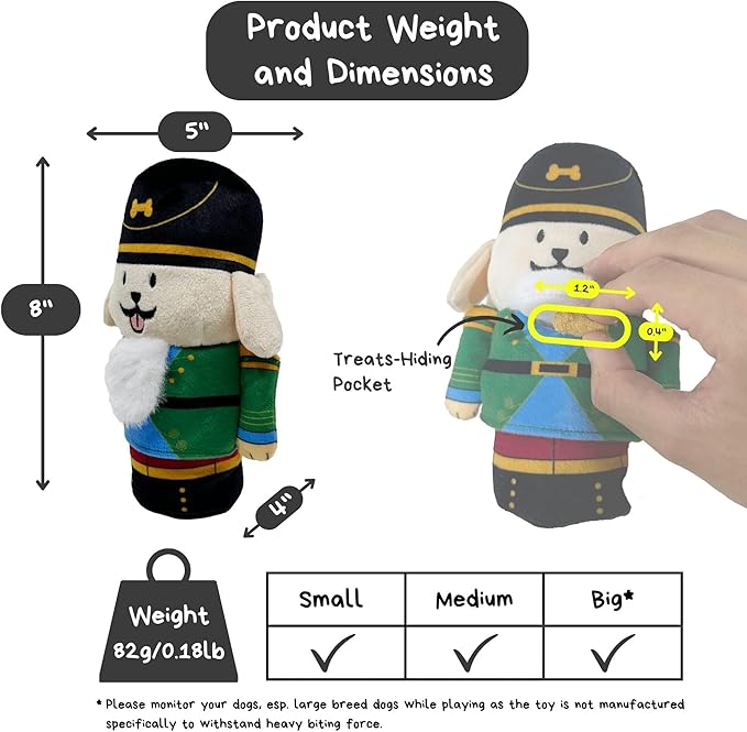 Nutcracker Treat-Dispensing Soft Plush Squeaky Pet Toy - Christmas/X’Mas Festive Enrichment Gift, Durable Cute&Fun Toy for Interactive Play,Hide Food for Nose-Work Puzzle, Small Medium Dogs