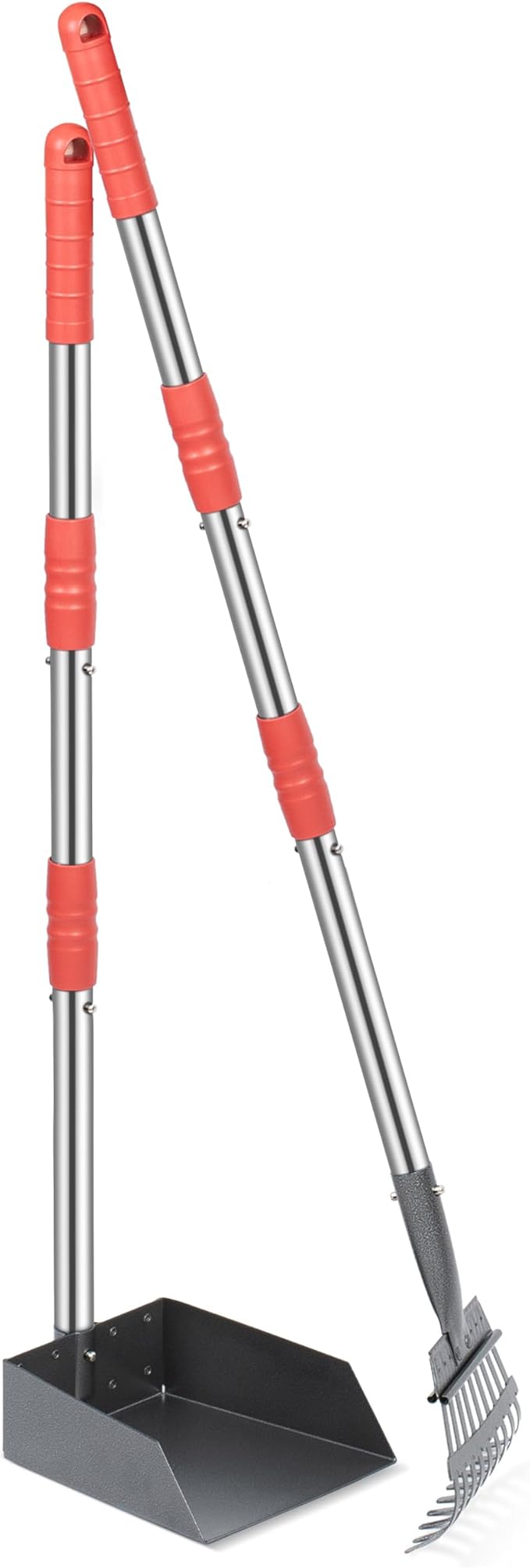 - Pooper Scooper Equipment in Pack: 1 tray and 1 rake kit meet almost all the needs of using. The size is over 37 inches, you need not bend over when clean pet poop.