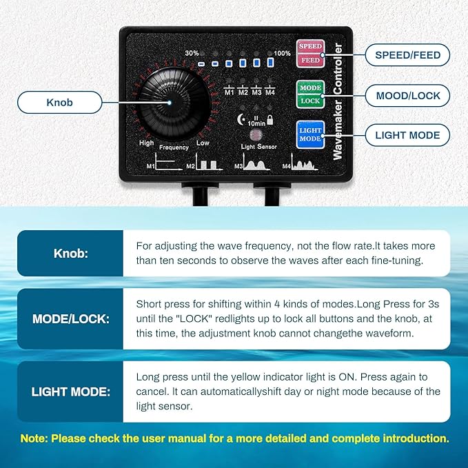 - ๐ใMulti-function Controllerใ: You can adjust 4 wave modes (M1/M2/M3/M4) as well as wave speed and frequency with the controller. The lock knob function helps to lock the wave parameters. There is also a feeding function and a light control function. A full range of quality services for the fish;