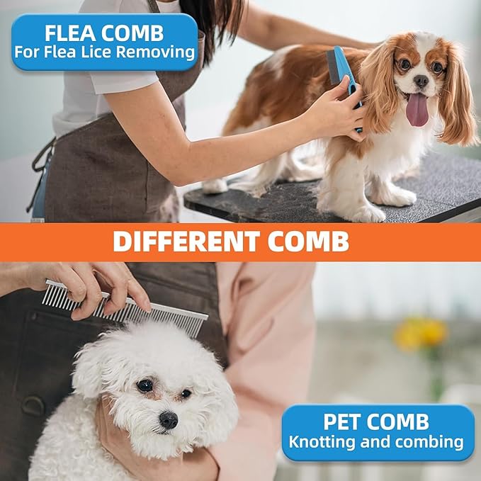 - A variety of different de-shedding tools:1. dog cat self-cleaning grooming brush can easily for pets shedding effortless ;2. double-sided de-shedding rake to remove the undercoat of the dog and cat, to reduce hair loss;3. bathing brush to thoroughly clean and massage every inch of the pet's hair ;4. coarse and fine tooth row comb for pet grooming styling, to remove the undercoat knotted tangled;5. flea comb to remove fleas