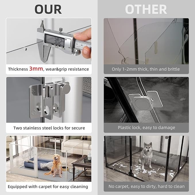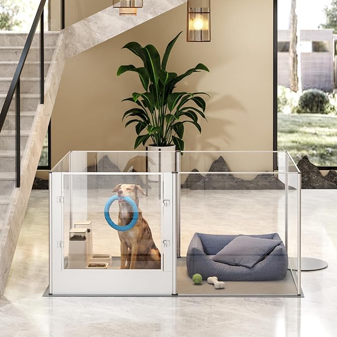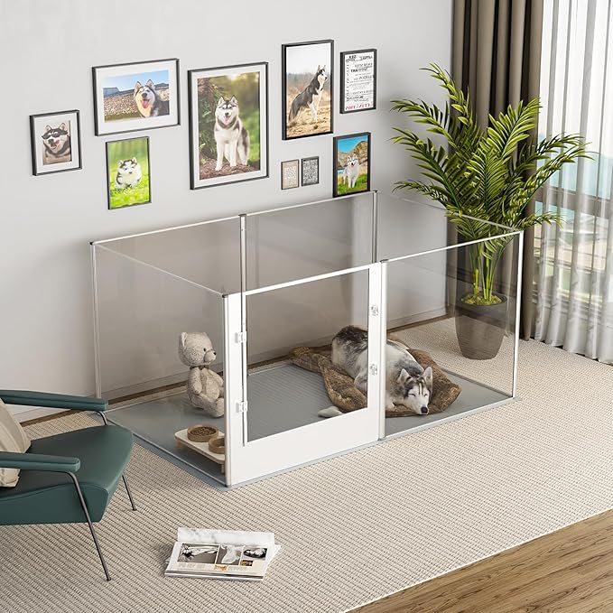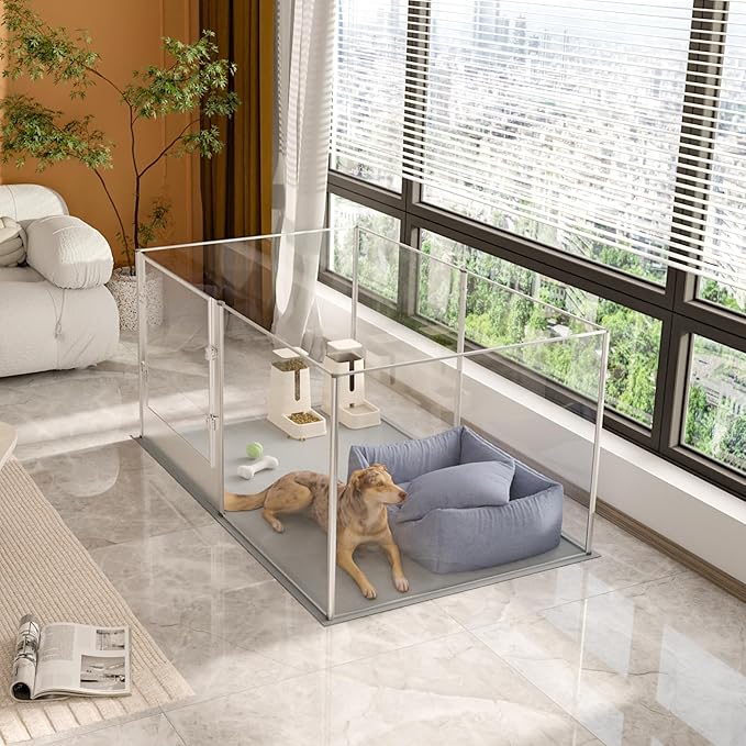 - Clear Acrylic Fence Design - Crystal-clear acrylic dog fence playpen enables you can interact with your pets closely, 360ยฐ high transparency and wide vision, itโll relieve your pets from anxiety, they also make sure you are by their side, equipped with a door for dog mom/ pets to come and go easily, so this is a unique gift for your loved friends, get this fence in the room, instantly improve the overall interiors
