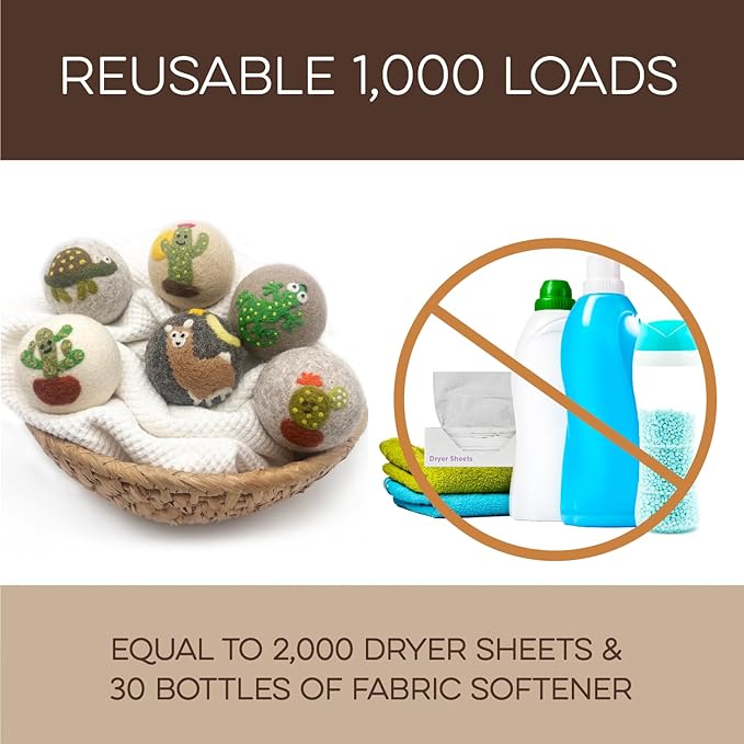 - REUSABLE FOR 1000+ LOADS โ REDUCE WASTE: Why keep buying disposable dryer sheets? These cute dryer balls last 1000+ loads, replacing 2000 dryer sheets or 30 bottles of fabric softener. Fluff Ewes dryer wool balls laundry reusable deliver a cost-effective solution for 2-4 years of hassle-free laundry. Make a smarter choice for your wallet and the environment.