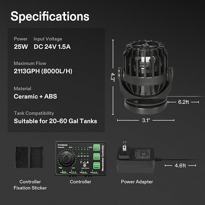 - Magnetic Base & Adjustable Head: The strong magnetic base enables secure and flexible wall installation; The integrated silicone mats minimize vibration and recoil; The 120ยฐ vertically adjustable head and 360ยฐ adjustable base promote comprehensive water circulation throughout the tank; Recommend for 20-60 Gallon aquariums with glass โค12mm (0.5โ) thick