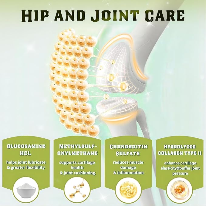 - Bone Health and Super Absorption: Our glucosamine chondroitin for dogs is rich in lactoferrin, magnesium and calcium, they has been proven to increase bone density and build bone structure, avoid reduced mobility and frequent fractures. In hip and joint supplement for dogs, adding magnesium and vitamin D directs calcium to where it should goโBONES, which means they improve calcium absorption and bioavailability. Vitamin C can help the synthesis of collagen and provide nutrition to the cartilage.