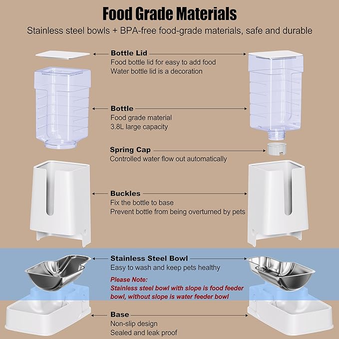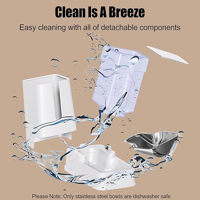 - Automatic Cat Feeder With Food Grade Stainless Steel Bowls: We upgrade the cat automatic feeders, both cat feeder and cat water dispenser equipped with detachable stainless steel bowls, It is easy to clean and diswasher safe. The PET and PP materials of the cat automatic feeders are BPA-free, resistanting to drop and pressure, and can be washed directly with cold water (can only be washed by hand). It is recommended to wash once a week
