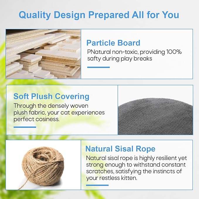 - 🐱 【Posts for Scratching Covered in Sisal 】These are scratching surfaces that are integrated into the framework. Cats love to bury their claws in sisal because it's a sturdy substance with a coarse texture. Our cat tree promotes healthy scratching habits and helps discourage cats from damaging furniture by offering dedicated spaces for them to scratch.