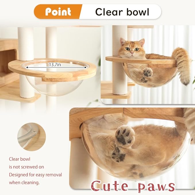 - Private Cat House & Acrylic Bubble Lounge-Includes a cozy wooden cubby with a cute cat-head opening for privacy and an acrylic bubble perch to satisfy your catโs curiosity and love for elevated views.