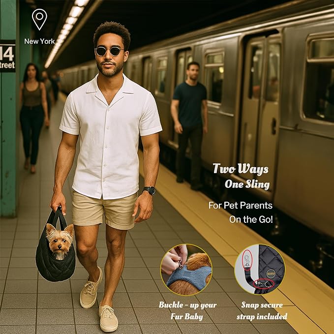 - Make a statement with this Silk Black small dog sling bag, combining fashion and function in a hands-free carrier that doubles as a secure small dog travel sling with deep zippered pockets.