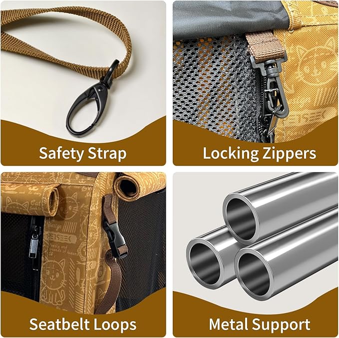 - SAFETY DESIGN- Each access has a zipper lock to prevent cats from escaping. On the side have seatbelt loops, can fix the carrier in the car. The internal metal support structure may also provide good protection for pets.