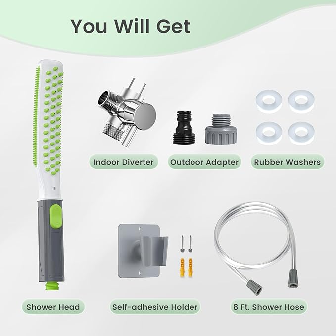 - 【Complete Pet Bathing Attachment】includes the pet shower head, 8-foot flexible hose, garden hose adapter, a self-adhesive holder, and indoor T-diverter. This all-in-one pet shower attachment ensures a high-quality cleaning experience for your furry friends at home. Enjoy peace of mind with our 24/7 customer support for any questions or concerns.