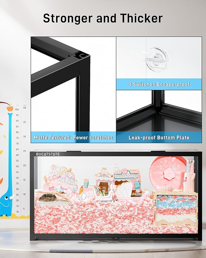 - 【Chew-proof & Sturdy Hamster Tank】Made with thickened clear acrylic panels and a chew-proof metal frame, this dwarf hamster cage is perfect for keeping your little escape artist safe. Four clear-view windows allow you to easily spot your pet at any time.