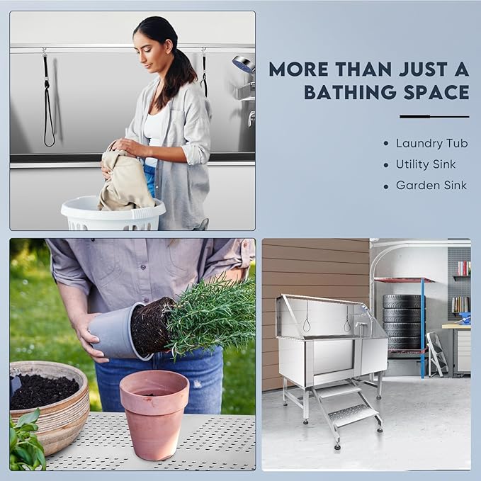 - 🐱【Stainless Steel Material】: The dog bathtub is made of 304 stainless steel, and the heavy-duty pet grooming tank is 62Lx28Wx42H, which can accommodate dogs of various sizes, especially dogs (maximum capacity -280lbs), including the shower head, faucet, and stainless steel support frame of the dog bathtub. It can be directly connected to household hoses, all of which are made of stainless steel structure and can be used for a long time