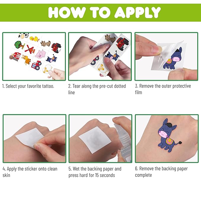- 🐄TATTOOS FOR FARM BARNYARD ANIMAL THEMED DECORATION: FARM DIE-CUT TATTOOS for people who love farm, farmhouse , Animal. Featuring 6 sheets with 72 pcs of lovely, fun and colorful design: Cow, pig, horse, tractor... Each sheet measures 6.3 * 4.7 inches. You can temporarily tattoo them on your body or objects such as phones, bottles, laptop…