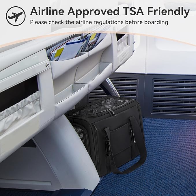 PETSFIT Soft-Sided Cat Carriers & Car Seats with Patent Safe Buckles, Clip-On Harness, 18"x11"x11" Airline Approved Pet Carrier - 9 lbs Capacity (Black)