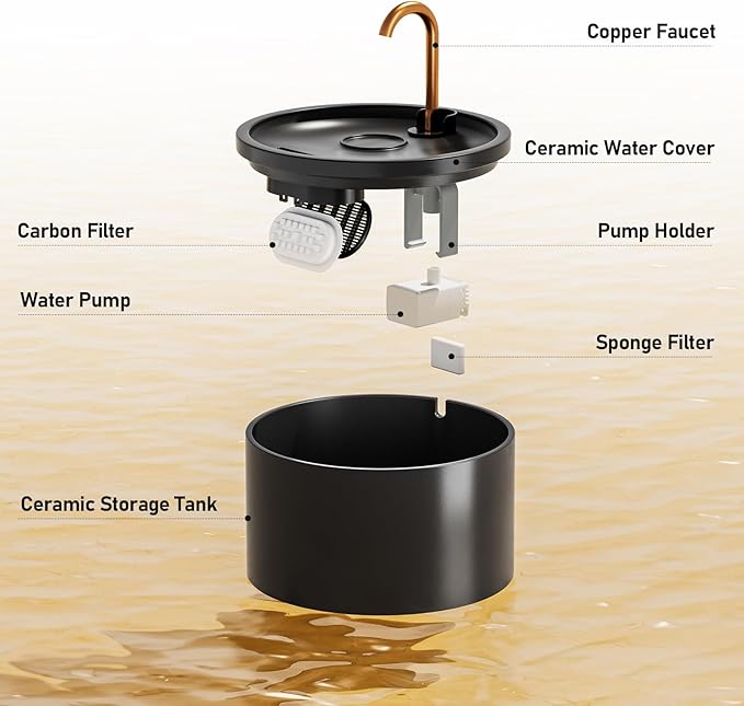 - ✔Multiple FILTRATION SYSTEM: The ceramic cat water fountain is equipped with a double filtration system of carbon filter and sponge. The sponge can filter impurities, and the carbon filter can capture hair and soften water quality, improve taste, Provide purer water for your lovely pets.