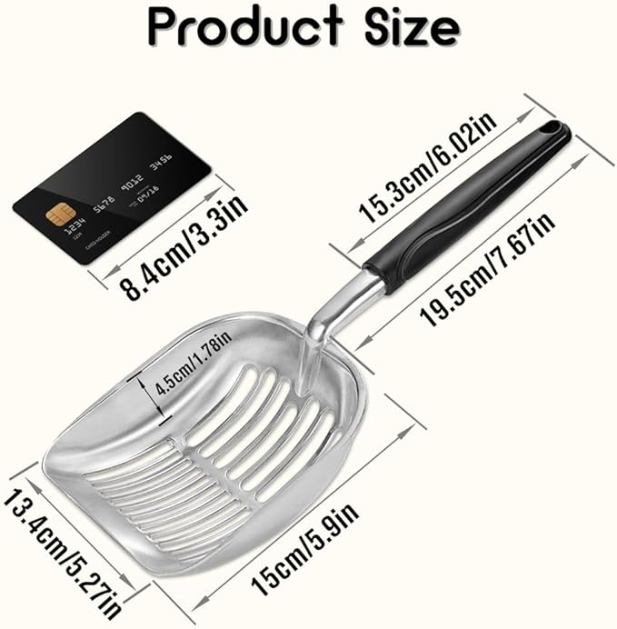- 【Long Handle】7.6in long black plastic handle, no longer need to worry about touching cat feces. This metal scoop also has a hook design, so you can hang it next to the cat litter box and use it at any time.