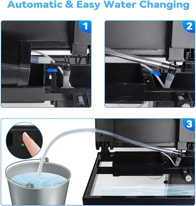 - Built-in 3-in-1 Filter System: The desktop fish tank is equipped with a quiet, hidden pump that provide filtration, oxygenation, and water circulation, creating a healthy environment for your fish while reducing maintenance. It also comes with a hose for easy water changesโjust connect it to the pump for a quick and hassle-free water exchange, keeping your tank clean with minimal effort.