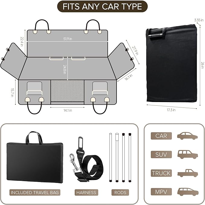 - A PERFECT MATCH FOR YOUR DRIVE LIFESTYLE - Dog car seat large size dog designed to fit a wide array of vehicles from sedans to SUVs and pickup trucks. It's the ultimate accessory for dog owners who demand the best for their furry friends. With dog back seat cover hard bottom, you can enjoy peace of mind knowing that your pet is in comfort and no matter the journey. We're committed to providing satisfactory solutions for any inquiries with the backseat cover for dogs in car