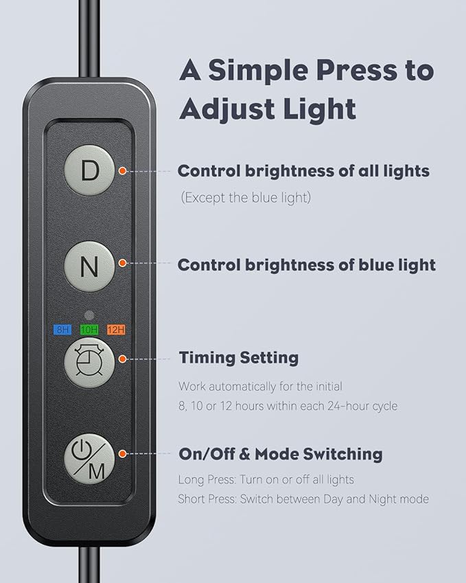 - 2 Lighting Modes: Short press the M button repeatedly on the LED aquarium light to switch between daytime and night modes. Hold the M button for 3 seconds to turn all lights off. Simulate natural sunrise and sunset to enliven fish and help them sleep wel
