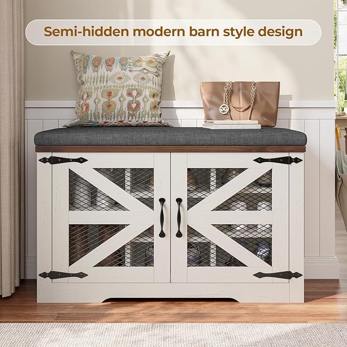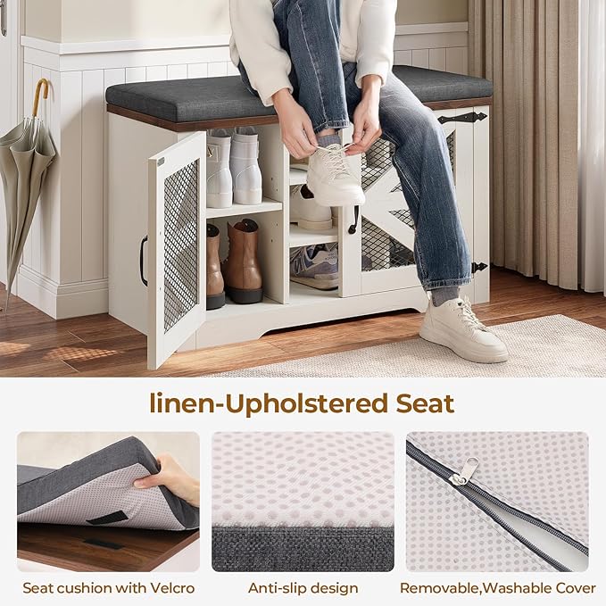 Farmhouse Storage Bench with Cushion, Metal and Wood Shoe Rack Organizer, Adjustable Shelf, Shoe Cabinet with Half Hidden Storage Space, for Entryway, Bedroom, Living Room (Old White, 31.4in)