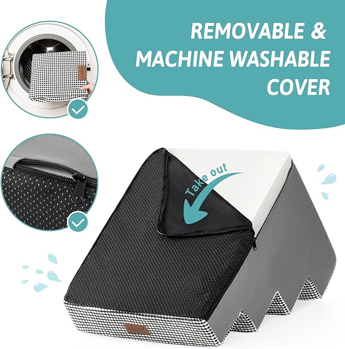 - Non-Slip Base and Removable Cover: Our dog steps for beds are equipped with a non-slip base featuring rubber dots for extra grip, minimizing movement during use. The pet steps cover is waterproof inner side, so you donโt have to worry about stains seeping into the foam. The outer cover is removable and machine washable for easy cleaning
