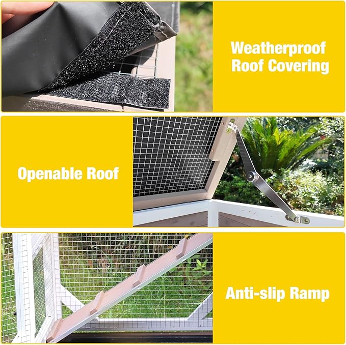 - Openable Roof: The openable roof provides convenient access for feeding and interaction. Additionally, the waterproof roof covering protects your pet from the elements and also provides shade on summer days making rabbit hut suitable for both indoor and outdoor use