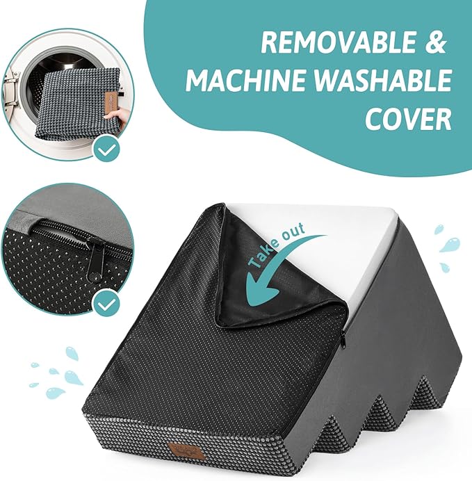 - Non-Slip Base and Removable Cover: Our dog steps for beds are equipped with a non-slip base featuring rubber dots for extra grip, minimizing movement during use. The pet steps cover is waterproof inner side, so you donโt have to worry about stains seeping into the foam. The outer cover is removable and machine washable for easy cleaning