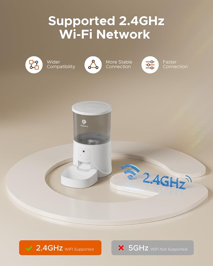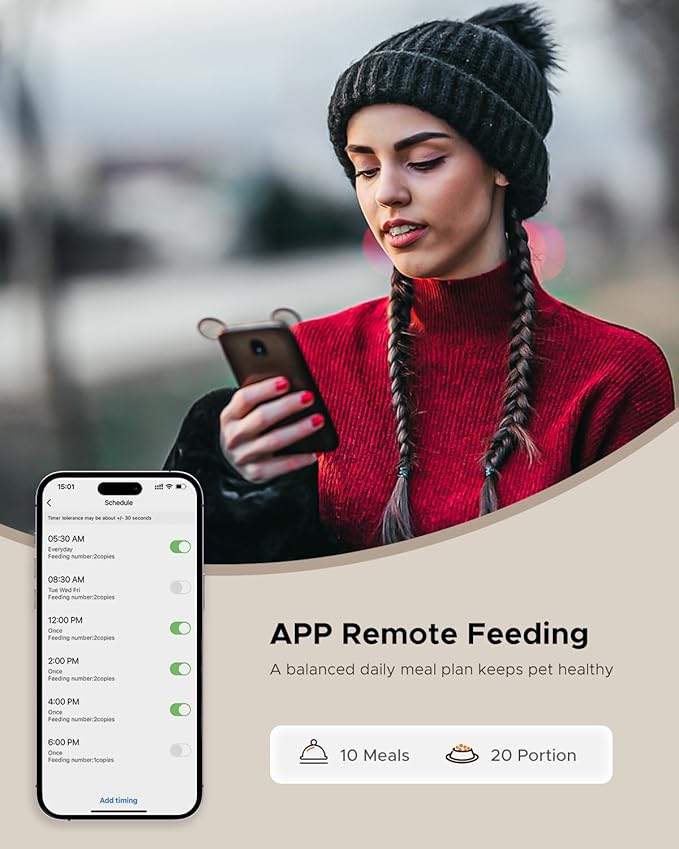 - Convenient APP Control Feeding: The WiFi-enabled automatic cat feeder is equipped with 2.4GHz WiFi connectivity (not for 5G). Easily program and monitor your pet's meals from anywhere, anytime. Customize 1-10 meals/day with portions ranging from 1 to 20 per meal, and effortlessly keep track of the feeding logs to ensure your cat or dog enjoys a consistent feeding schedule correctly, all within the app
