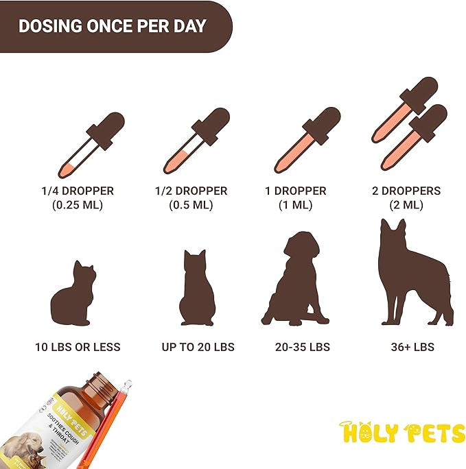 - SIMPLE AND CONVENIENT DOSAGE: Just add to your petโs food or water once or twice daily. For small pets (up to 20 lbs), use ยฝ drop; for pets between 20-35 lbs, use 1 drop; for larger pets (36 lbs and up), use 2 drops. The liquid formula is tasteless, free of chemicals, and easy to administer, making it a great alternative to pills, syrups, or chewables