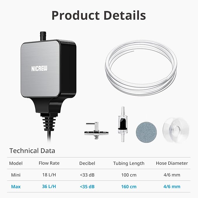 NICREW Nano Silent Aquarium Air Pump Black, Aquarium Aerator with Accessories for UP to 20 Gallon Fish Tank, Super Quiet, 0.6 L/min, 1.5 Watts
