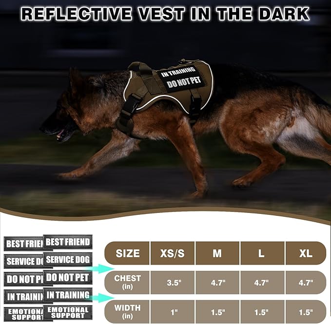 - 【Mesh Design Harness with 10 Dog Patches】: This tactical dog harness with Soft breathable mesh helps dog to have extra airflow, quick to dry for all seasons. Aire mesh harness have a good fit and extra stability. The package contains a WINSEE dog vest harness and 5x2 pieces of dog patches with sewed letters, such as “Service dog”, “do not pet”, “in training”, “emotional support” and “Service dog in training”, enough quantity for you to decorate the dog’s vest harness.