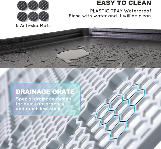 - Plastic Grate : It comes with a grass mats and a drainage grate to layer under the grass to separate it from the washable pee pads for dogs. The grate that keeps the grass above the pee pad keep feet/grass dry.