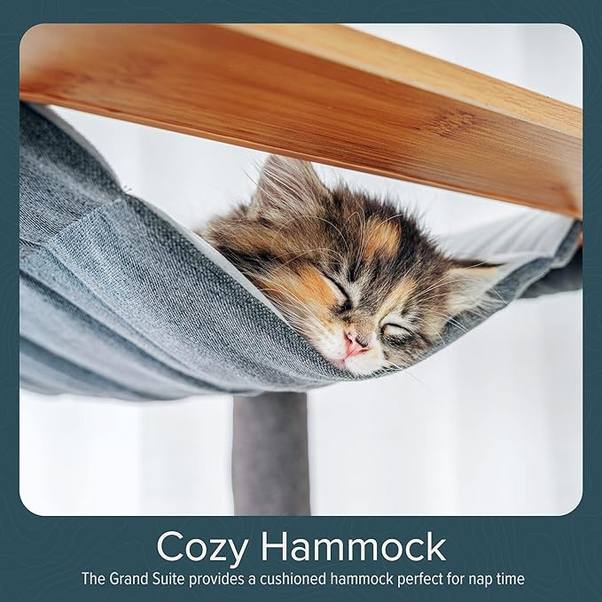 - PERCHES, HIDEAWAYS, AND TOYS - Watch your cat explore the Grand Suite as they scale heights, curl up in the hammock or dens, and jump between viewpoint perches. The scratching posts and spring, feather, and catnip toys ensure this interactive playground has something for every cat to enjoy.