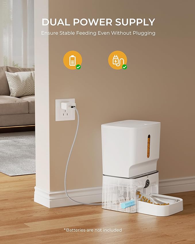 - RELIABLE DUAL POWER SUPPLY:With 5v external power cord, the automatic dog feeder with camera has built-in battery compartment as a backup power source, so the pet feeder can feed on schedule even if the power goes out or the internet is disconnected.