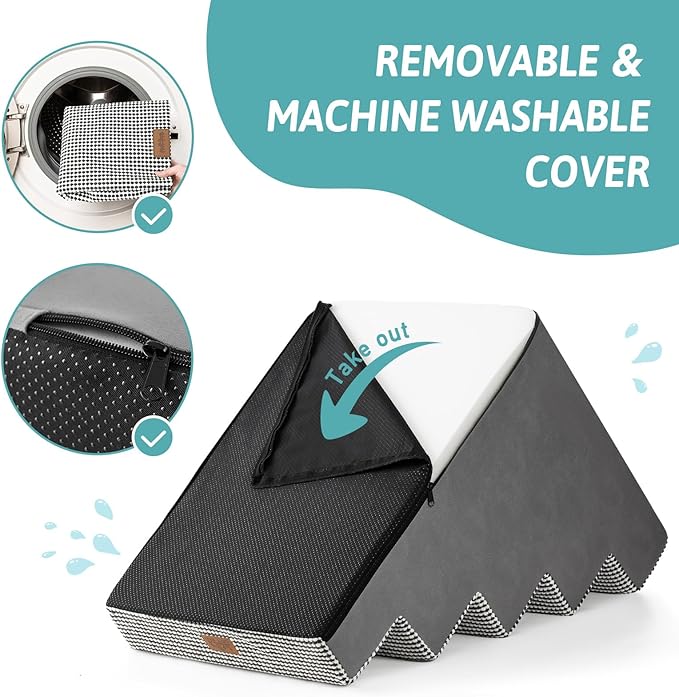 - Non-Slip Base and Removable Cover: Our dog steps for beds are equipped with a non-slip base featuring rubber dots for additional grip, minimizing movement during use. The pet steps cover is waterproof on the inner side, so you donโt have to worry about stains seeping into the foam. The outer cover is removable and machine washable for easy cleaning