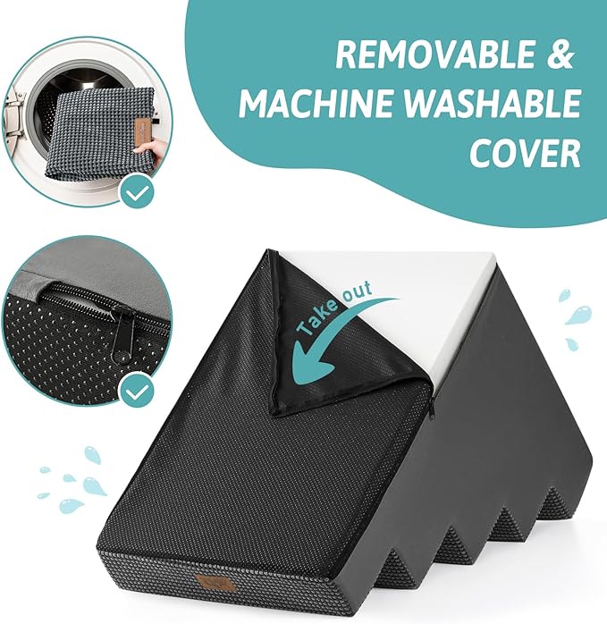 - Non-Slip Base and Removable Cover: Our dog steps for beds are equipped with a non-slip base featuring rubber dots for additional grip, minimizing movement during use. The pet steps cover is waterproof on the inner side, so you donโt have to worry about stains seeping into the foam. The outer cover is removable and machine washable for easy cleaning
