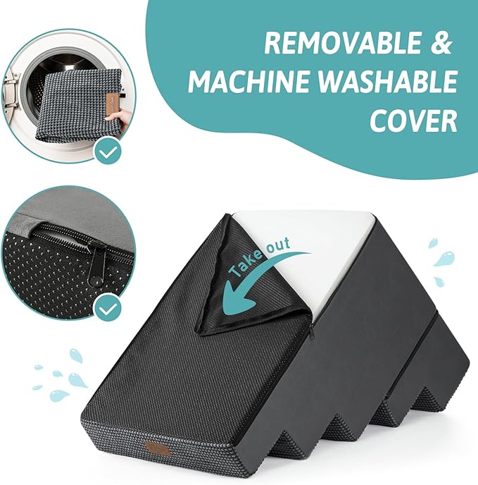 - Non-Slip Base and Removable Cover: Our dog steps for beds are equipped with a non-slip base featuring rubber dots for extra grip, minimizing movement during use. The pet steps cover is waterproof on the inner side, so you donโt have to worry about stains seeping into the foam. The outer cover is removable and machine washable for easy cleaning