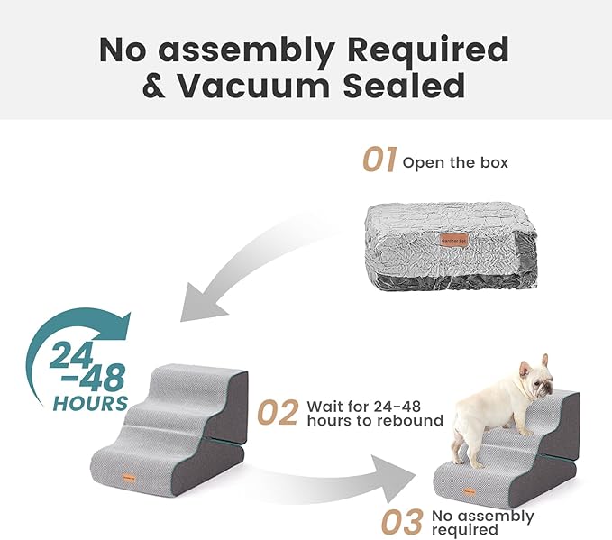 - No Assembly Required: The dog stairs for bed is convenient and hassle-free, simply unbox the pet steps, your furry friend can start using it right away. Due to vacuum compression, the surface of the puppy stairs may appear slightly wrinkled, and it will recover within 24-48 hours.