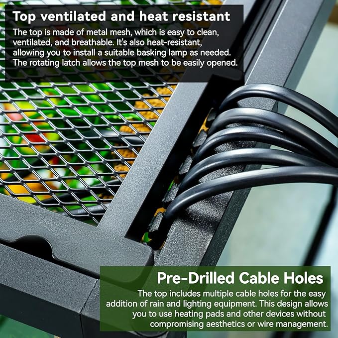 - 【Pre-Drilled Cable Holes】The top includes multiple cable holes for the easy addition of rain and lighting equipment. This design allows you to use heating pads and other devices without compromising aesthetics or wire management, making it suitable for any reptile tank, from a snake cage to a crested gecko tank.