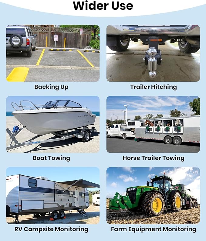 - Stable Signal You Can Count On:Whether you’re backing a pickup into a tight driveway or guiding your RV through a crowded campground, this wireless backup camera for trailer keeps the connection rock-solid. Enjoy a smooth, real-time view with no lag or frozen frames—so every move feels precise and under control