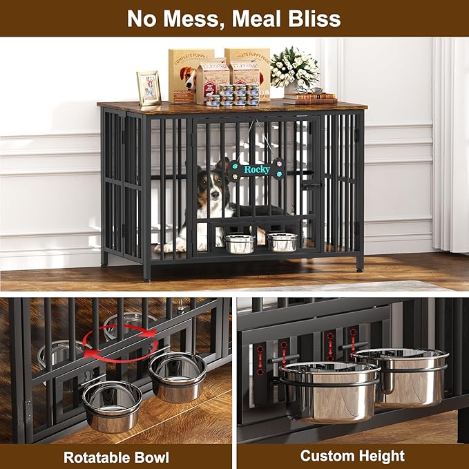- 【Convenient Feeding】Our dog kennel indoor has a swivel door that makes the stainless-steel dog bowls 360° rotatable. The bowls can be adjusted to two heights, suiting dogs of different sizes. It makes meal easy and pleasant for dogs and then avoid the scatter of food, sparing your cleaning trouble