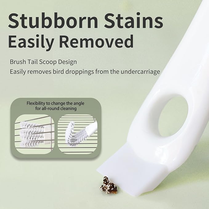 - 【Multi-Functional Bird Cage Cleaning Brush】Designed with a dual-head feature, this bird cage cleaning brush ensures efficient and thorough cleaning. The front end has stiff bristles to quickly remove bird droppings between cage wires, while the sharp shovel at the tail easily scrapes off hardened debris.