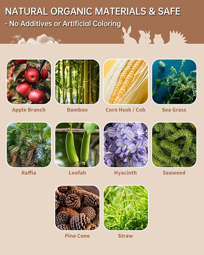 - Perfect Gift for Critters and Pet Owners: The chew toy and treat pack is ideal for small animals like rabbits, guinea pigs, hamsters, and other rodents. Perfect for both indoor and outdoor use, itโs an essential accessory for cages, playpens, hutches, enclosures, and fences. A thoughtful gift for pet lovers, offering natural materials for chewing, foraging, and entertainment.