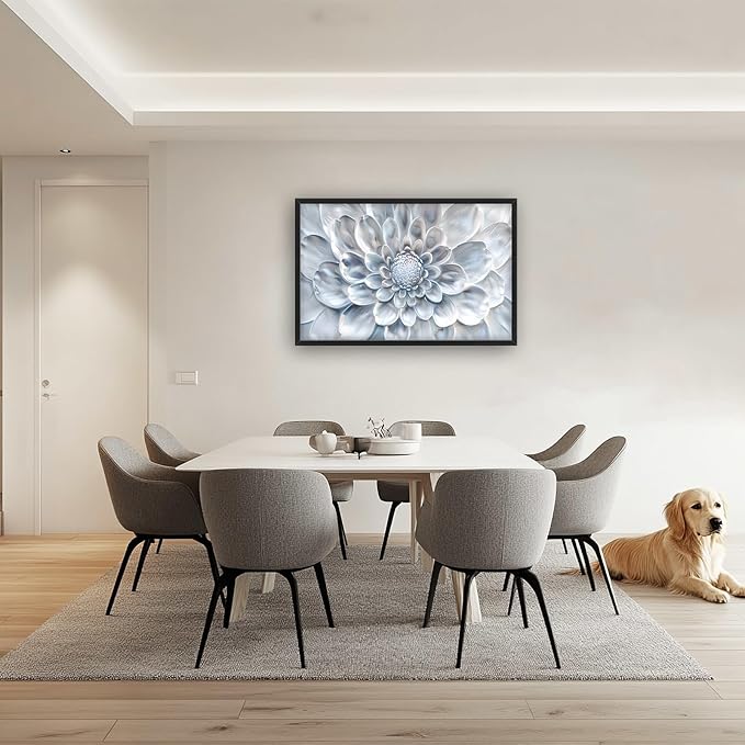 - 【Unique Design】A close-up of an elegant dahlia flower, its petals rendered in soft silver tones and delicate textures, creating a sense of depth that emphasizes the intricate details of each petal. The background is a subtle gradient from light grey to pale blue, adding a touch of sophistication to the overall composition. This image captures the essence of modern wall art with a focus on realism and high-resolution detail.